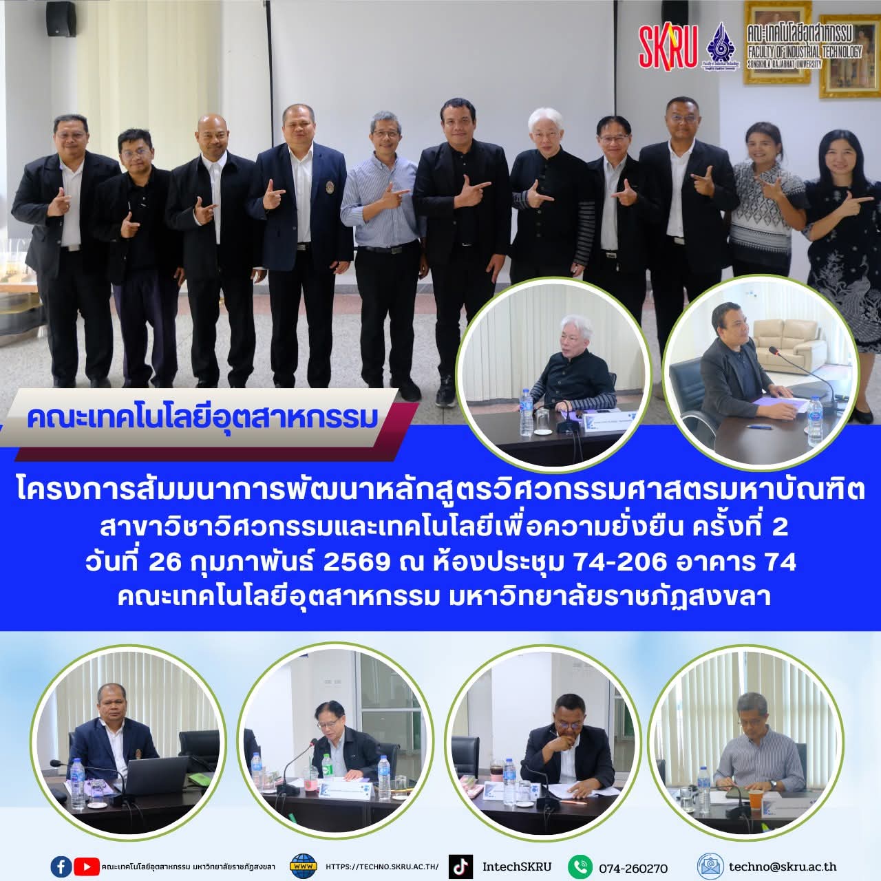 วันพฤหัสบดีที่ 26 กุมภาพันธ์ พ.ศ. 2569 เวลา 08.30–16.30 น. ณ ห้องประชุม 74-206 ชั้น 2 อาคาร 74 คณะเทคโนโลยีอุตสาหกรรม มหาวิทยาลัยราชภัฏสงขลา ได้จัดโครงการสัมมนาการพัฒนาหลักสูตรวิศวกรรมศาสตรมหาบัณฑิต สาขาวิชาวิศวกรรมและเทคโนโลยีเพื่อความยั่งยืน ครั้งที่ 2 เพื่อพัฒนาหลักสูตรระดับบัณฑิตศึกษาให้มีความทันสมัย สอดคล้องกับบริบทการเปลี่ยนแปลงด้านวิศวกรรม เทคโนโลยี และการพัฒนาอย่างยั่งยืน ตลอดจนตอบสนองต่อความต้องการของภาคอุตสาหกรรมและสังคม จัดวันพฤหัสบดีที่ 26 กุมภาพันธ์ พ.ศ. 2569 เวลา 08.30–16.30 น. ณ ห้องประชุม 74-206 ชั้น 2 อาคาร 74 คณะเทคโนโลยีอุตสาหกรรม มหาวิทยาลัยราชภัฏสงขลา